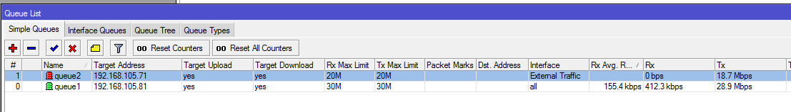 Привет! Только что купили наш первый Mikrotik 2011LS и столкнулся с трудностями в настройке управления трафиком. Подозреваю, что я что-то фундаментальное не понимаю. Интернет подключен к ETH1, а ПК — к ETH5, и я хочу использовать Mikrotik как прозрачный ограничитель пропускной способности для ETH5/4/3/2, чтобы назначать разные скорости. Как видно на прикрепленном скриншоте, я настроил мост для всех портов от 1 до 5, а затем попытался ограничить пропускную способность. Первая проблема в том, что ограничение в 2M, которое я установил для соединения ETH5, не работает. А вот ограничение на ETH1 работает. Вторая проблема в том, что мост, который я настроил на портах 1-5, не показывает трафик, который видят интерфейсы. Интерфейсы показывают полные 5M, а мост показывает всего 90K (см. скриншот). Я изучил документацию, и там все выглядит так, как должно работать? Я удалил всю маршрутизацию / файрвол / все остальное, что могло бы помешать. Есть какие-нибудь идеи? Спасибо.