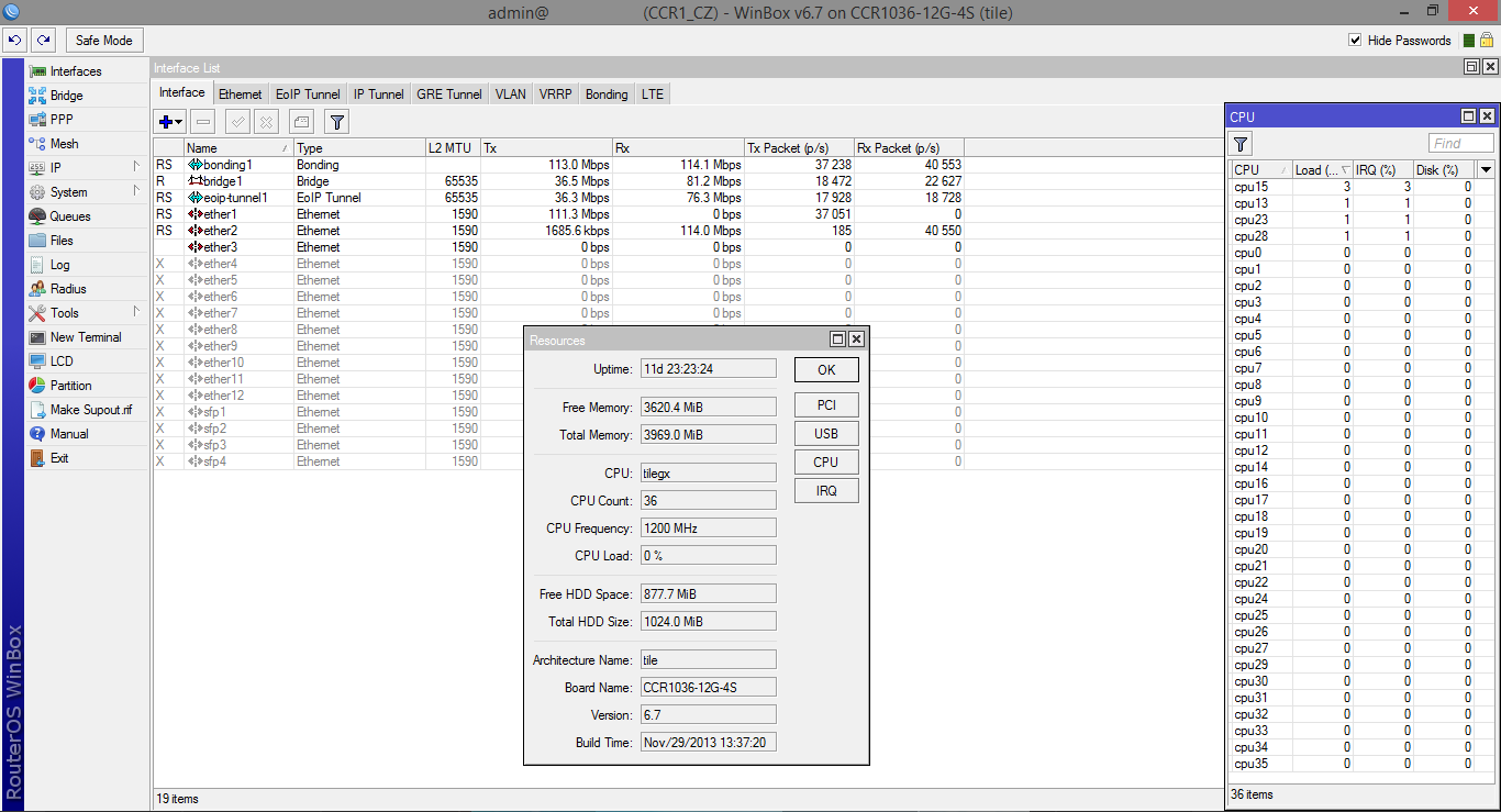 Привет, это реальный трафик более 200 Мбит/с в полнодуплексном режиме через L2TP-туннель? Около 300 000 TCP-соединений. На обоих концах CCR1036-8G-2S+. WAN-соединение с обеих сторон — 1 Гбит/с. Спасибо.