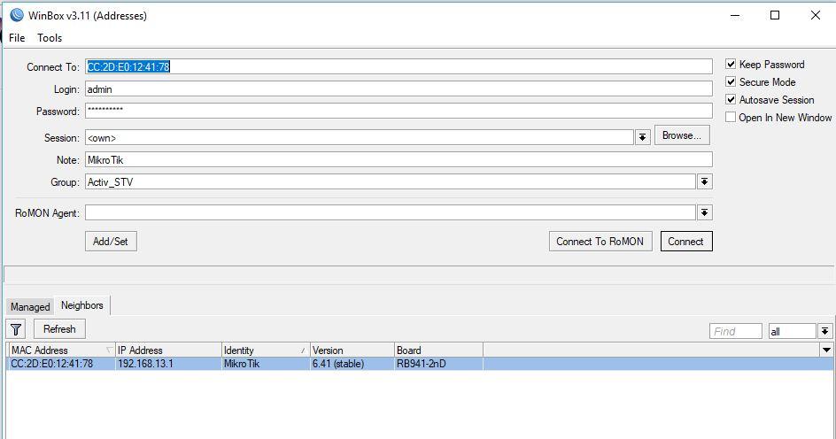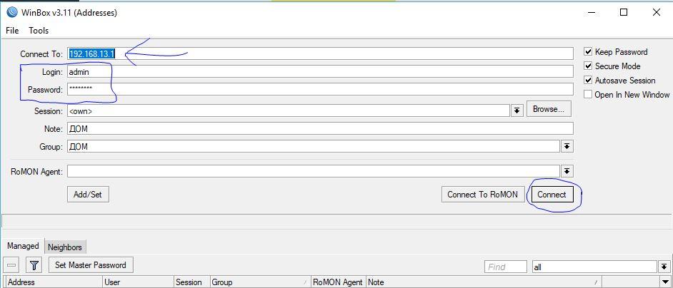 - Connect To RoMON — подключение через RoMON-агент;