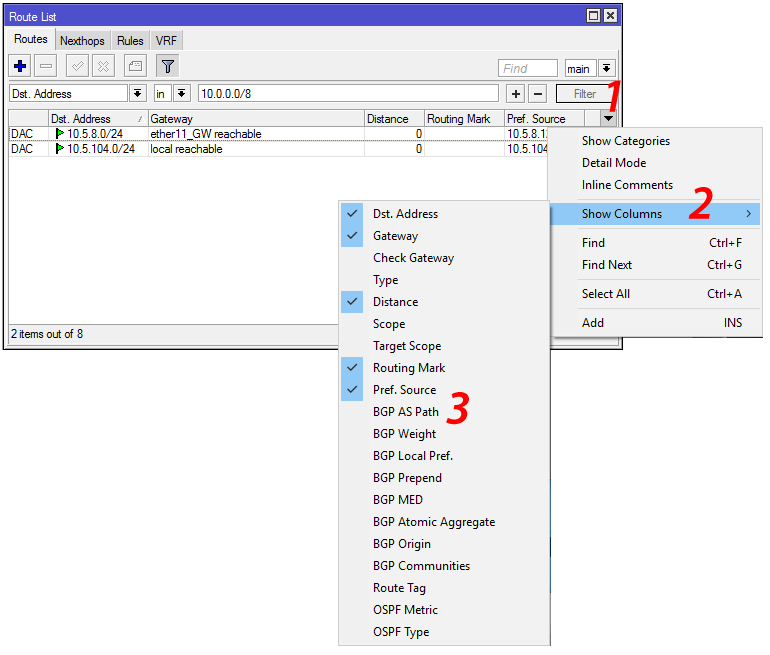 По умолчанию показаны базовые поля. Через контекстное меню выберите Show Columns и включите нужные, например BGP AS Path.